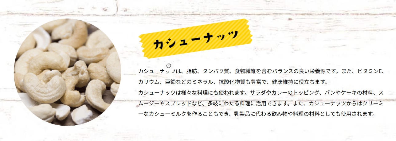 カシューナッツは、脂肪、タンパク質、食物繊維を含むバランスの良い栄養源です。また、ビタミンE、カリウム、亜鉛などのミネラル、抗酸化物質も豊富で、健康維持に役立ちます。